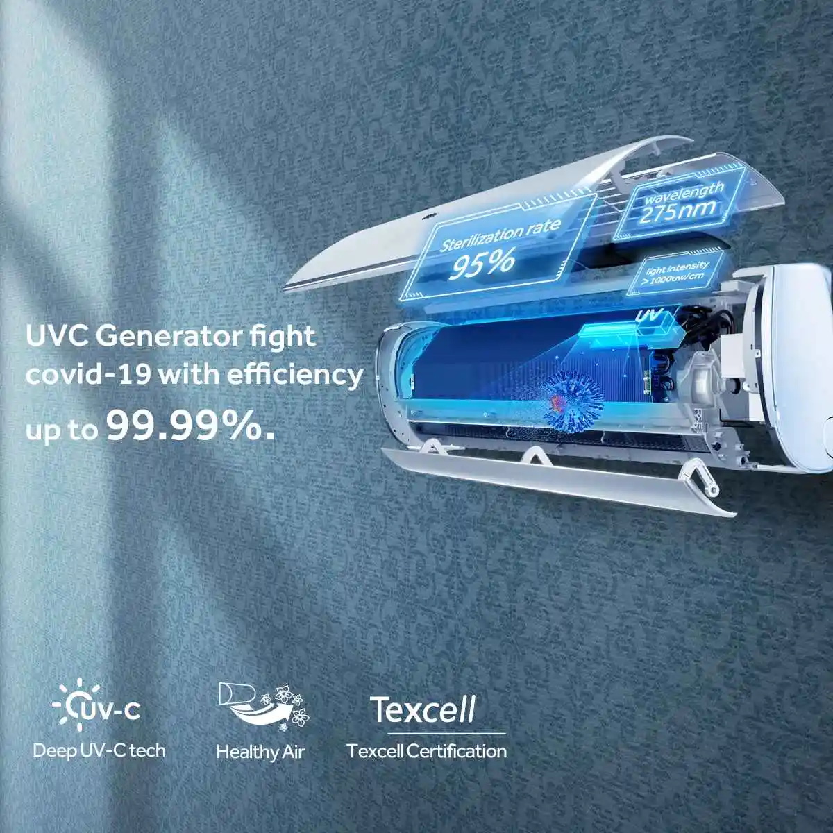 The UV lights emit rays near the air inlet, where room air flows into the AC. As the air passes through this area, airborne hazards are instantly eliminated.